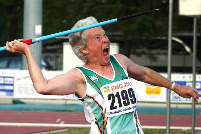 | Sheila Champion, Ireland, 75, women’s javelin 75–79 year old age group, European Masters Games, Lignano, Italy, 2011. ©Alex Rotas |
